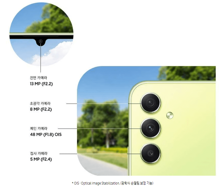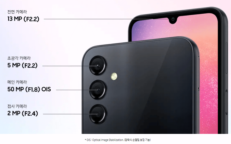 5G 모델인 A24는 자급제 LTE 모델 중에서 가장 최신 모델이며, 30만 원 대로 구입 가능합니다. 카메라 성능은 프리미엄 모델인 S23과 비슷한 형태이며, 화질을 결정하는 손떨림 방지 기능을 탑재하고 있습니다. 이 스마트폰의 최대 장점이라고 할 수 있는 배터리 용량은 5000mAh의 대용량입니다.