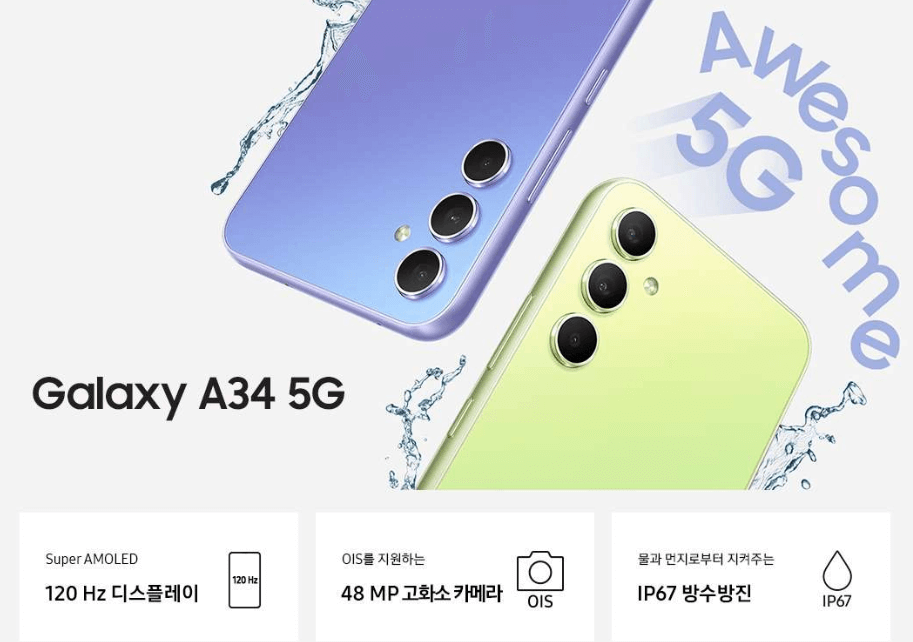 A24와 마찬가지로 물방울 모양의 카메라를 탑재하였으며, 4K 촬영이 가능하다는 특징이 있습니다. 화면 사이즈는 6.6인치로, S23과 동일한 사이즈입니다. A24와 마찬가지로 배터리는 5000mAh로 대용량을 자랑하며, IP67 방수 방진이 되어 오래 사용할 수 있습니다. S23+와 외양이 닮았는데 가격은 3분의 1 정도로 구입할 수 있는 것이 바로 A34입니다.